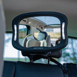 The EZI MIRROR LED is an extra large children's car mirror with LED lights for the back seat of the car. Especially for rear-facing car seats. Easily keep an eye on your child without having to turn around.