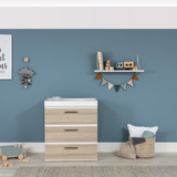 The generous 3-drawer dresser is finished in satin white and Nordic oak veneer with blushed satin chrome handles. The integrated changer top makes nappy-time easy and as baby grows can be removed to leave a stylish dresser.
