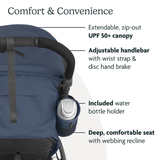 Sports seat: deep, comfortable seat with adjustable 5-point belt, reflective details, pull-out canopy with UPF 50+ protection, mesh insert and pocket with zip ( up to 22kg)